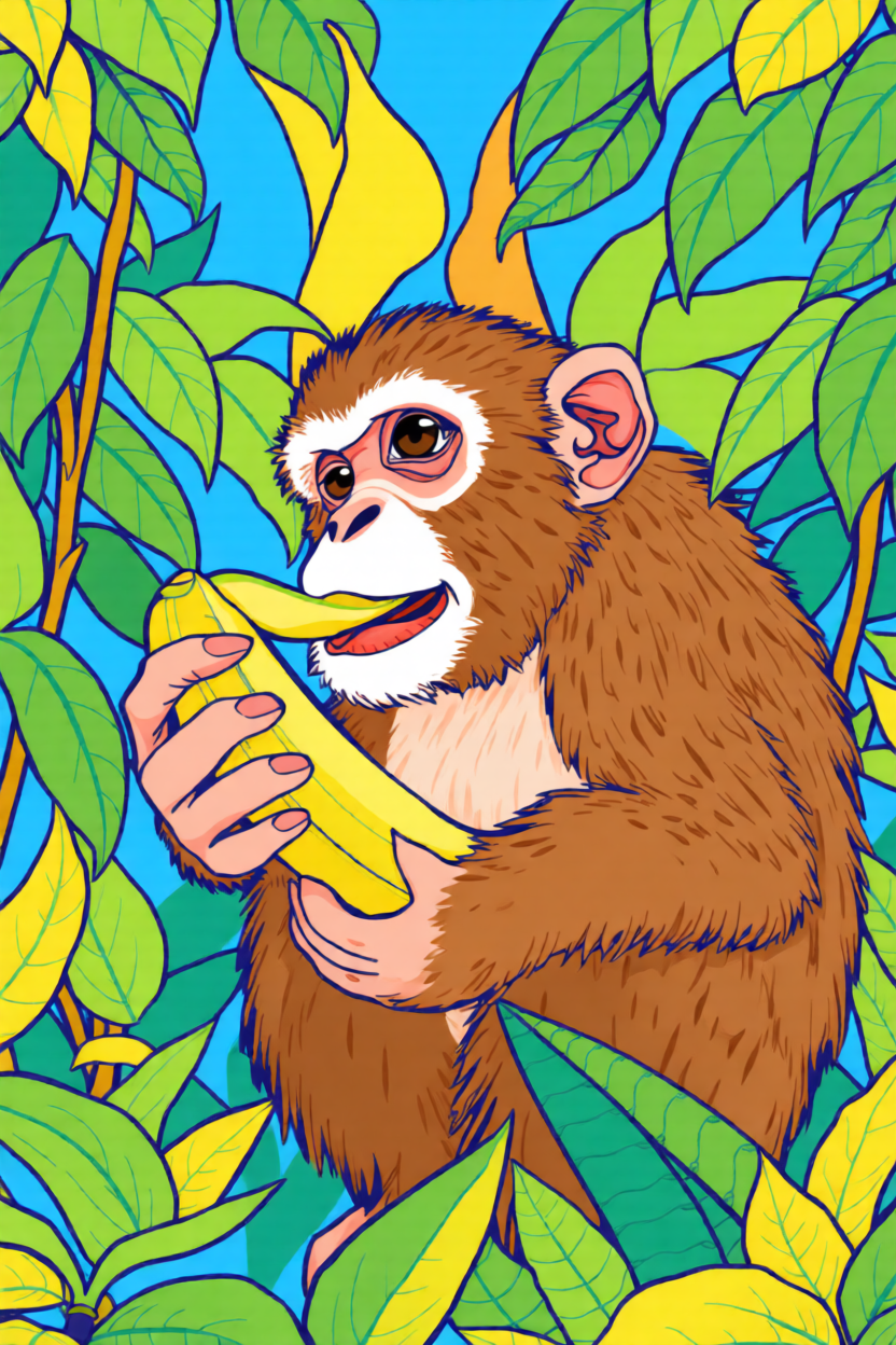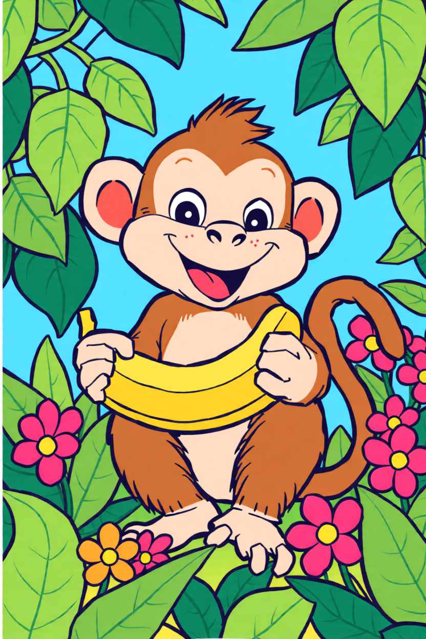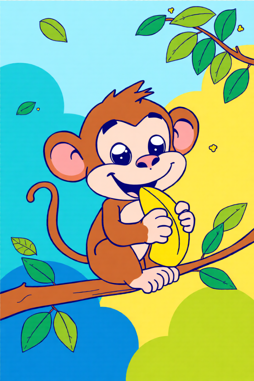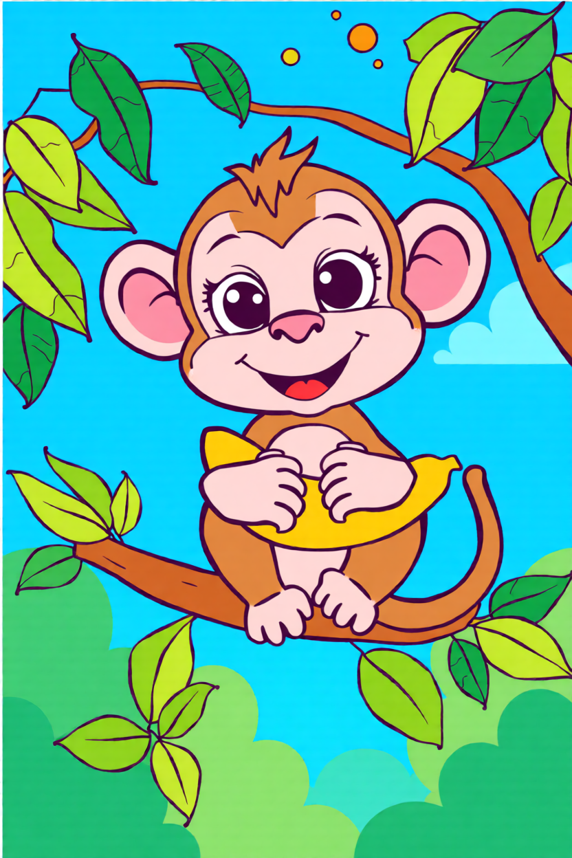 Choose a front-facing baby monkey, cartoon monkey head, or simple monkey holding a banana. Bold outlines and clear brown-tan color blocks convert much better than busy jungle photos.